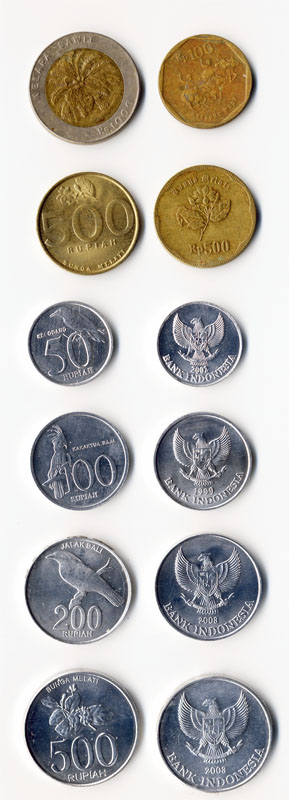 100、200、500、1000の4額面・新旧各数種類であるが、街中では不足気味で、端数はキャンディで返ってくるか、Rp1,000までは切り捨てられることが多い。